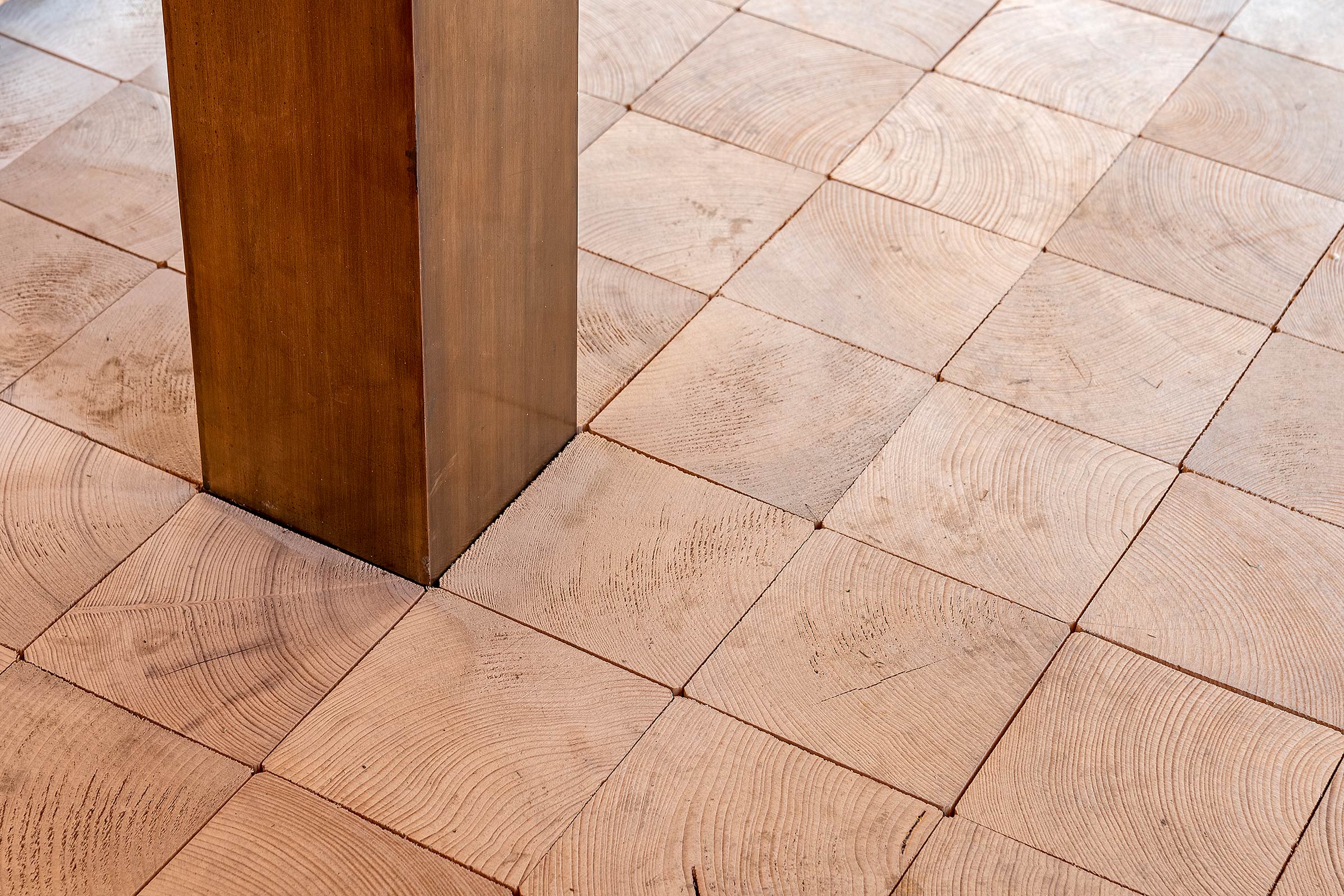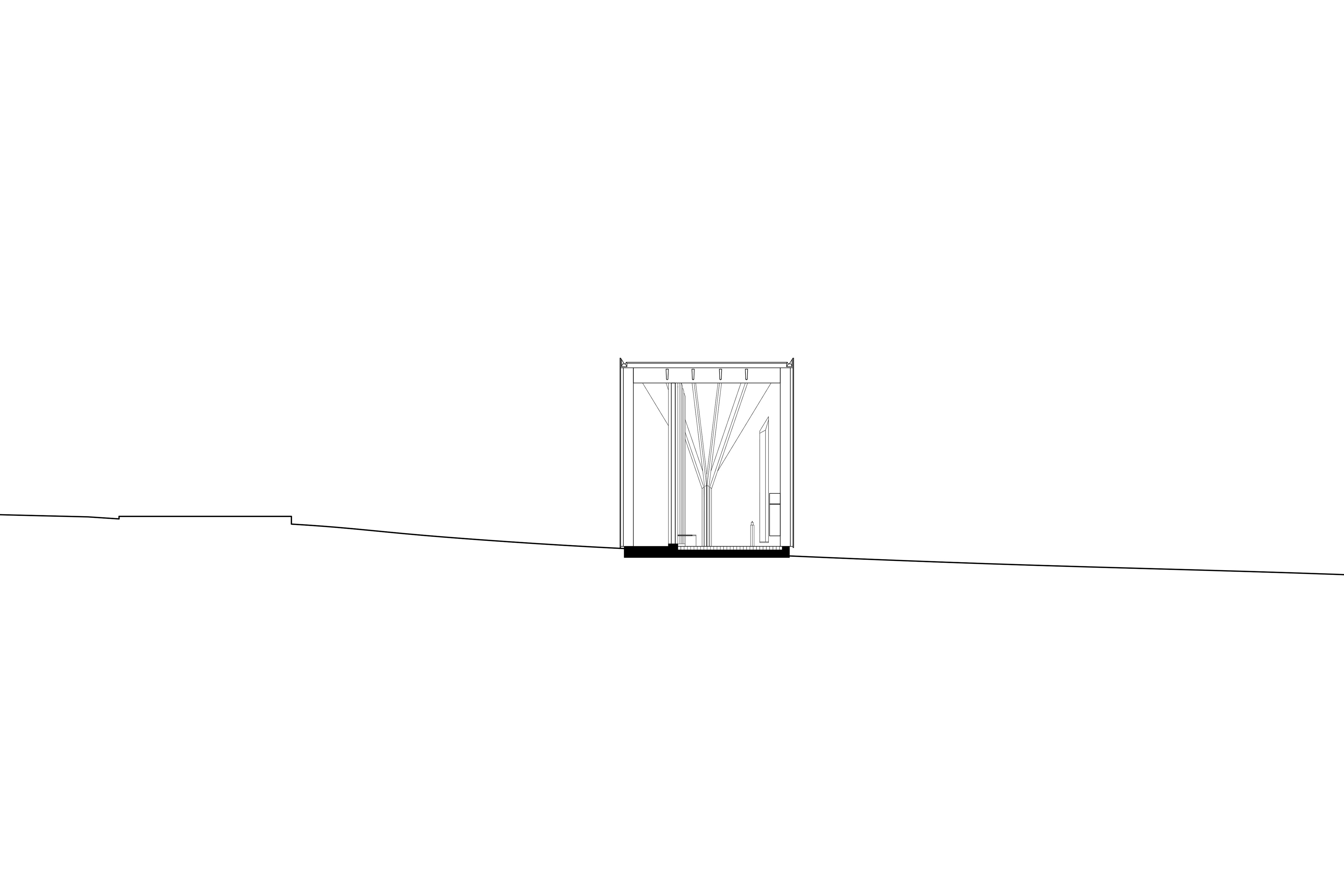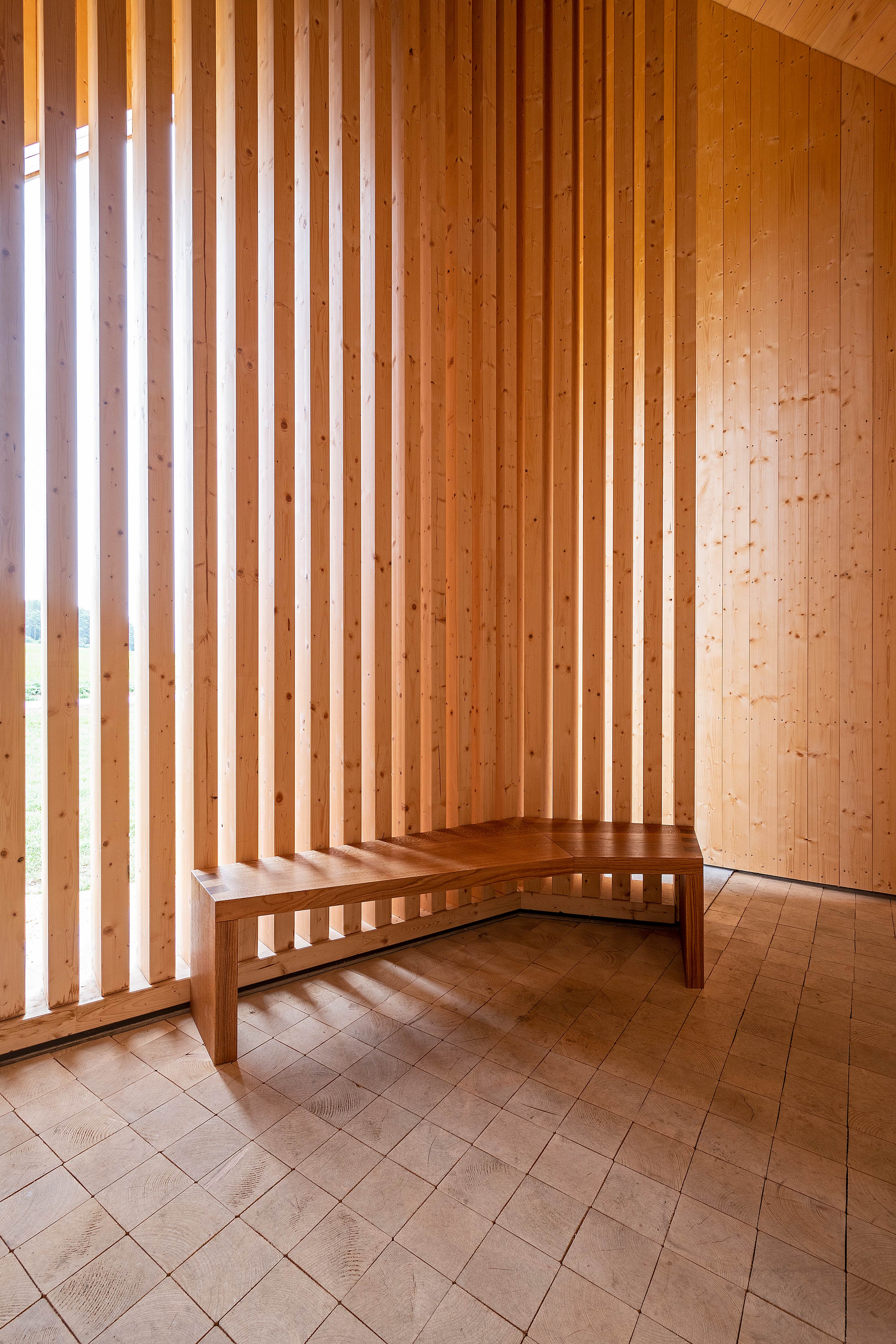 Die Kapelle ist ein Ort der Kontemplation in der Weite der Landschaft, die im Kontrast der Enge der Raumerfahrung deutlich wird. Der quadratische Raum wird überspannt von einem steilen hohen Sparrendach, das über der Diagonalen tief nach unten fällt. Der Blick durch das Stabwerk der nach innen verschwenkten Wand lässt den Innenraum erahnen. Der Eingang leitet vom Niedrigen ins Hohe, der First über der Diagonalen trägt die Richtung des Raumes. Innen fällt sanftes Seitenlicht über hohe Fensterschlitze, Kerzenschimmer und ein Kreuz. Das christliche Zeichen, das Weihwasserbecken und der Kerzenständer sind aus brüniertem und gebürstetem Tombakblech, einer hoch kupferhaltige Messinglegierung. Das Holzständerwerk, die unbehandelte Brettschalung und der Hirnholzboden sind aus heimischer Fichte. Die Schwalbenschwanzverbindung der Stäbe ist präzise maschinell hergestellt. Das Bauwerk ist ein Zeichen zeitgemäßer handwerklicher Baukunst, die auf ehrliche Weise die Art ihrer Herstellung erzählt.